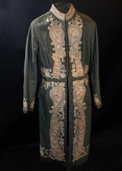 Khaki Green Denim Edwardian Style Embroidered Coat