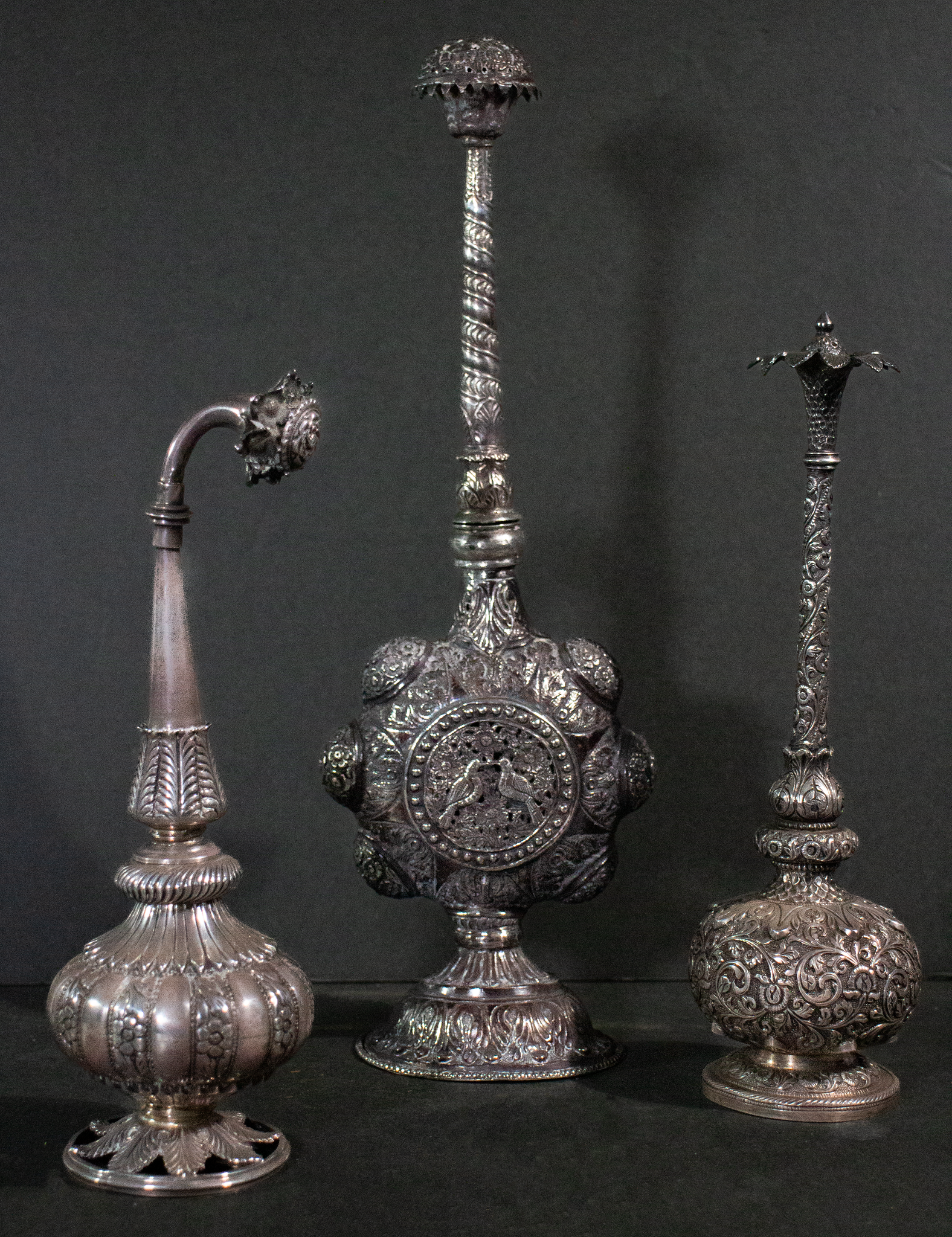 Three antique sprinklers of silver each unique yet characteristic of the vast array of sprinkler shapes and decorations on these perfumers. Sprinkler are used for greetings for house guests entering for the first time and or used at ritual gatherings.  All are silver and are late 19th /early 20th c