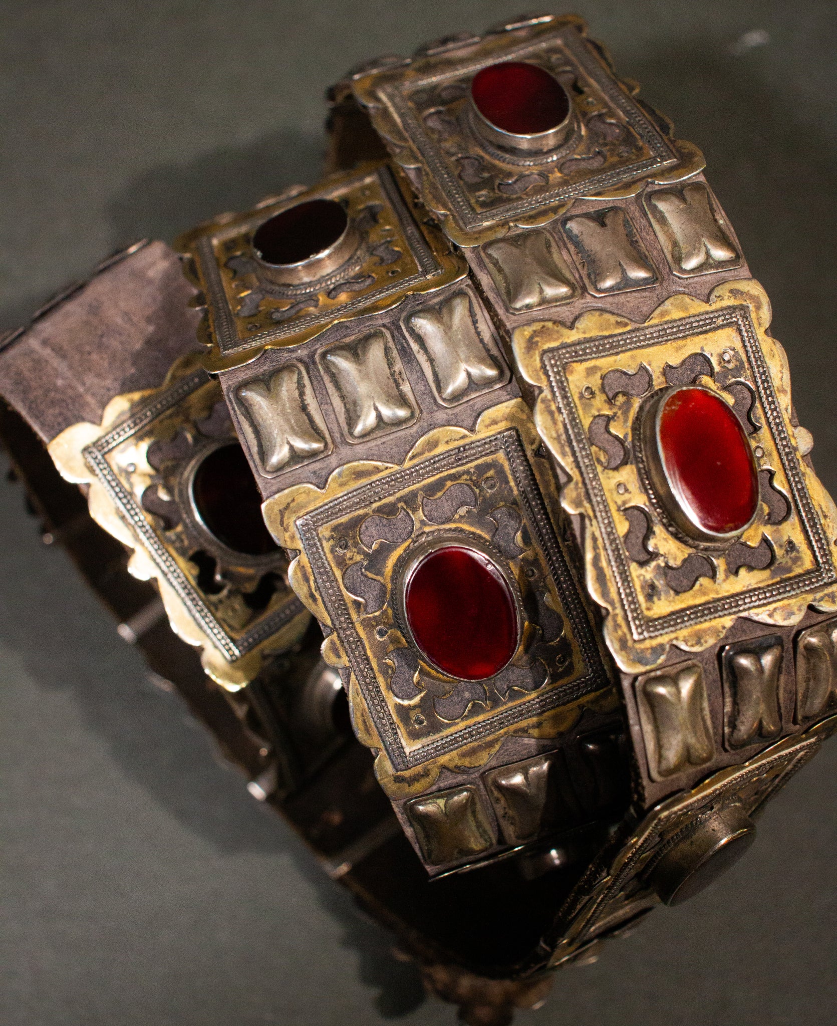 Stunning gilt silver and carnelian antique Turkoman leather belt, probably Tekke Tribe, circa 1940s.