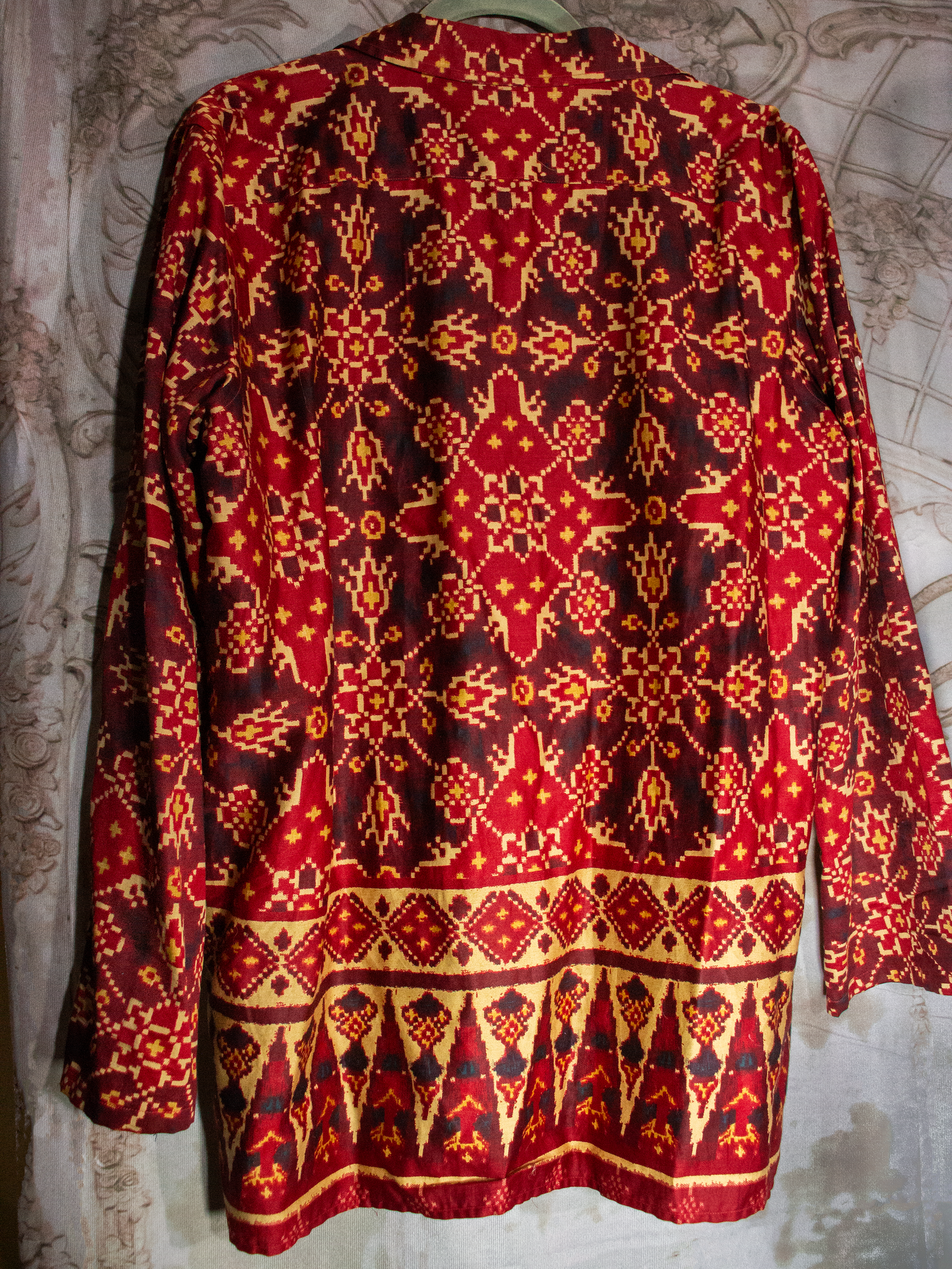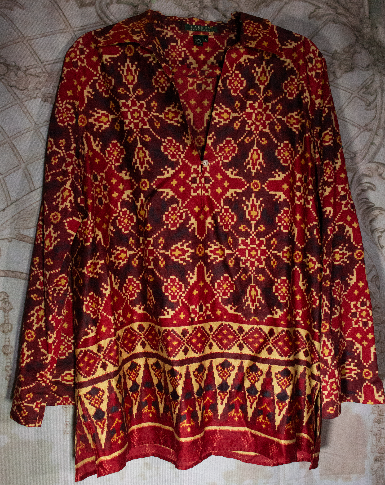 A silk ikat smock blouse with a traditional style ikat in rich reds , rusts and curry colors.