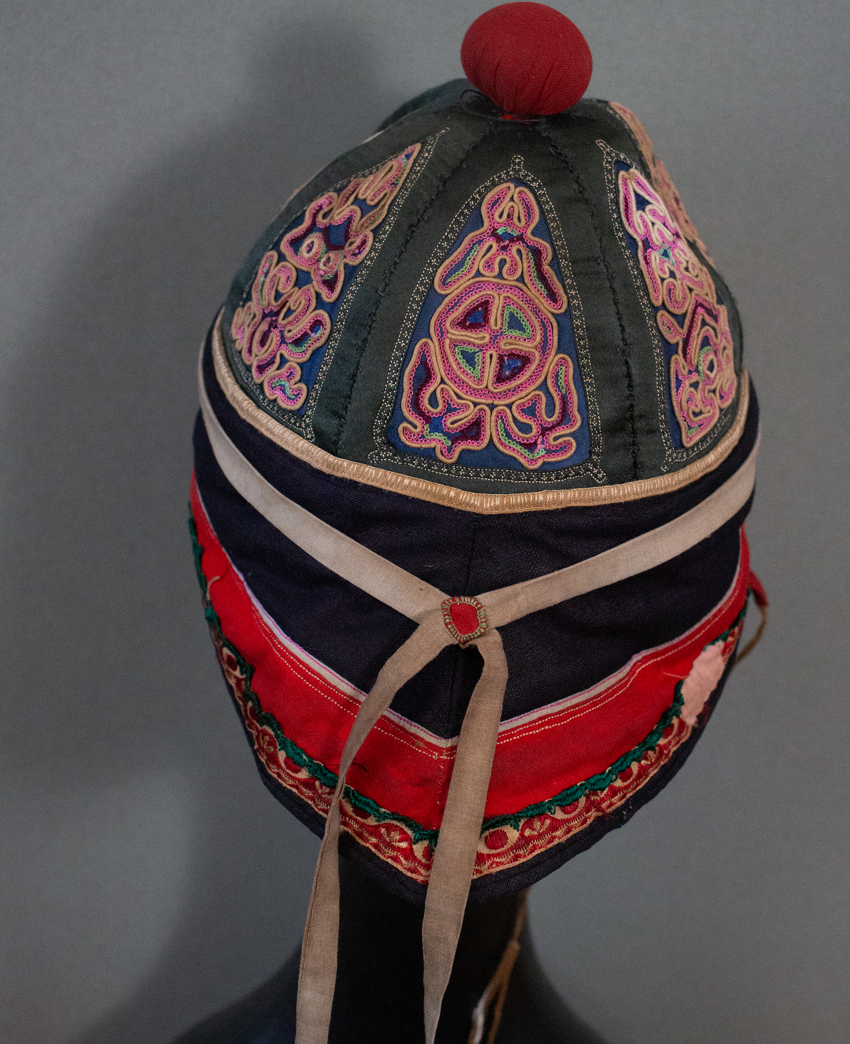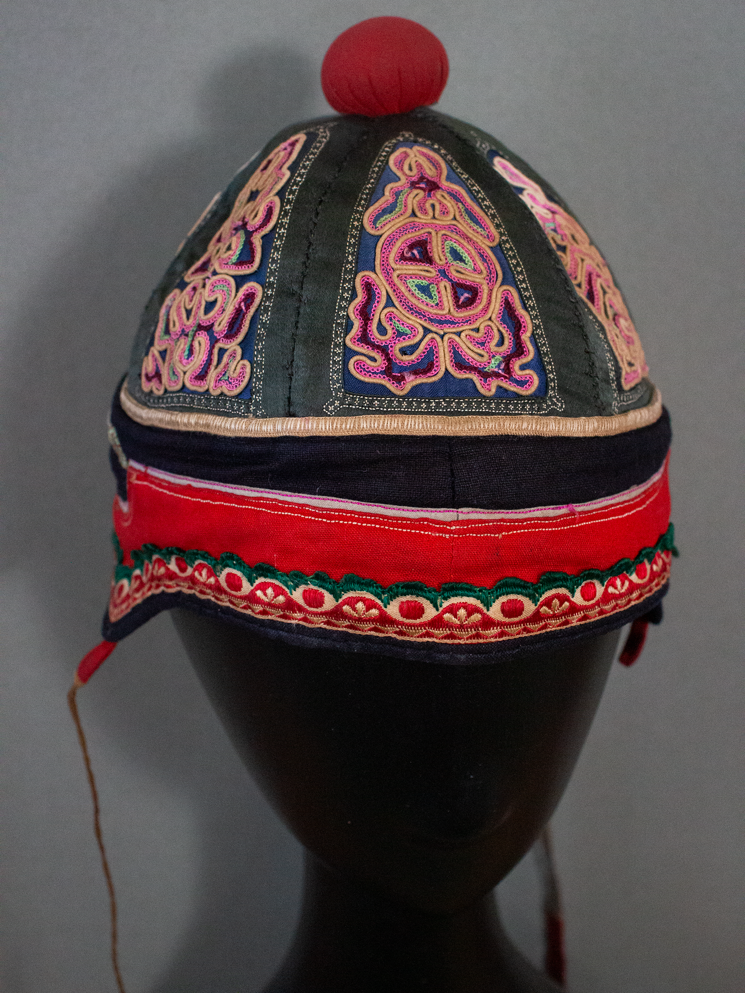 Applique and a embroidered headdress shaped like a British Bobby's hat. First half 20th c China