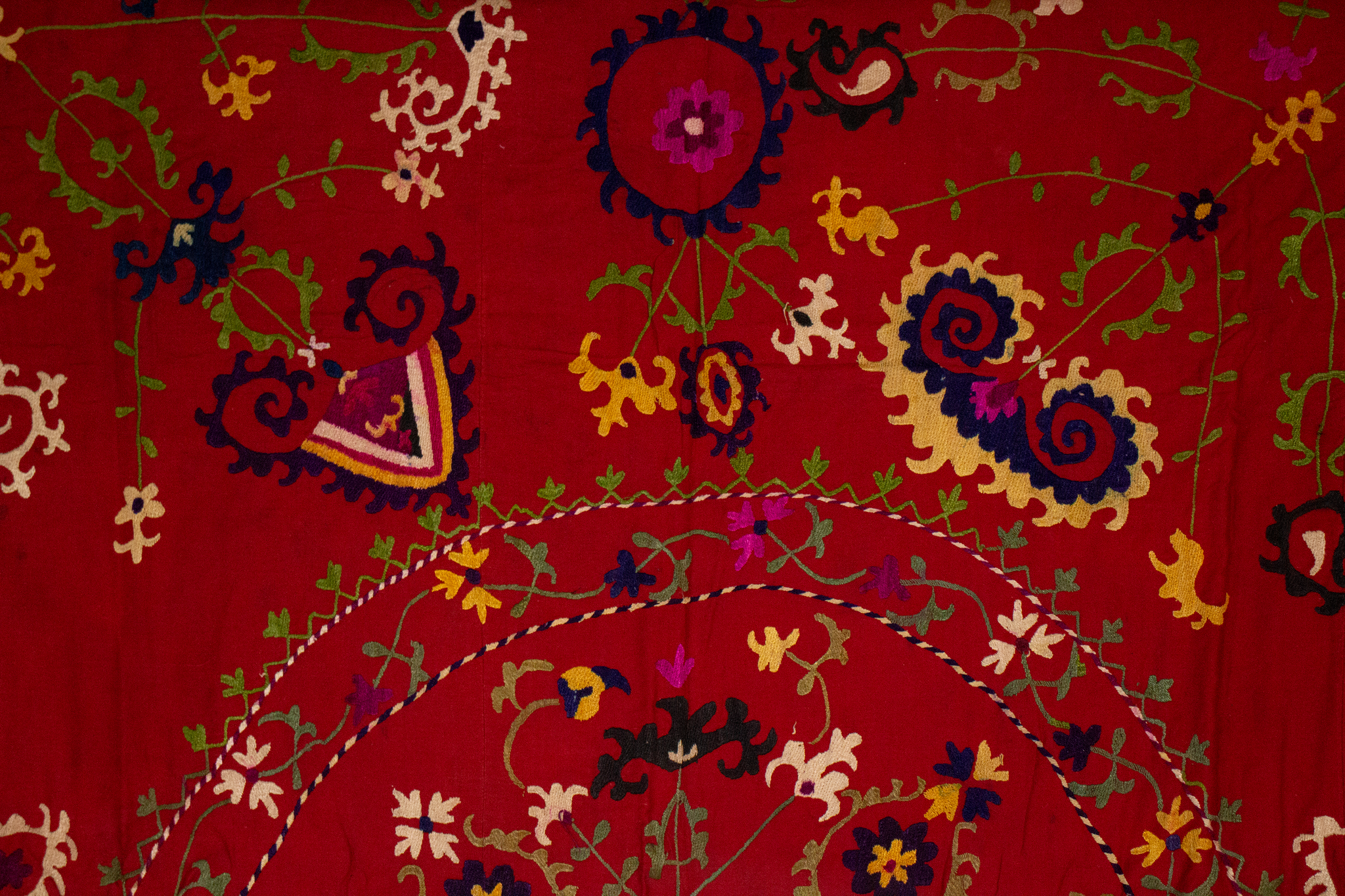 A Suzani with all over embroidery on cotton red ground most probably from the late 60's early 70's.