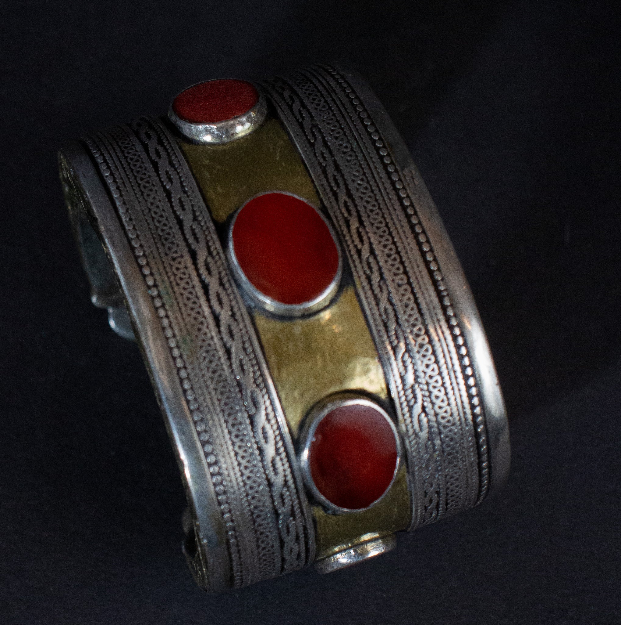 4)Cuff ( Bilezik) Highest quality silver w have gold gilt central panel with five” fire “ carnelian having decorative engraved detail on the top and botton edge. Yomud from Chorezm circa 1900-20
