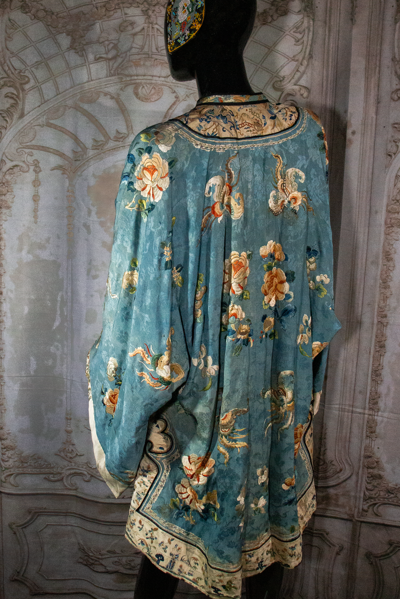 Powder blue robe, with an abundance of stitching technique including forbidden knot design, metal thread embroidery, silk floss , figural and floral motifs. Length and style are dating this to between early to mid 19th c