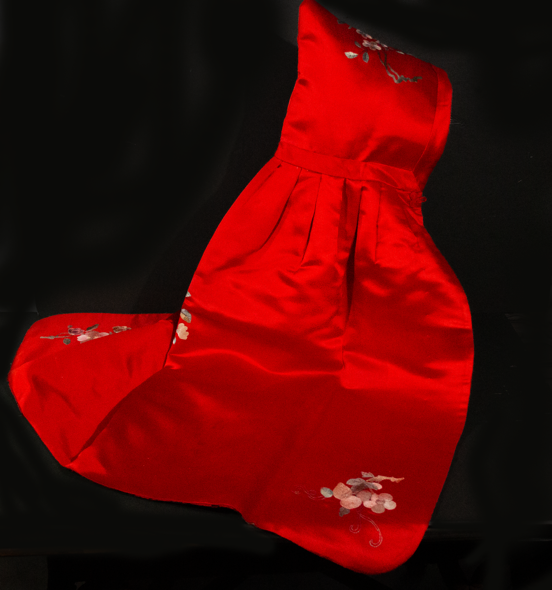 Red Silk Hood with Embroidery Flowers either Chinese or Korean , 1930's -40's.